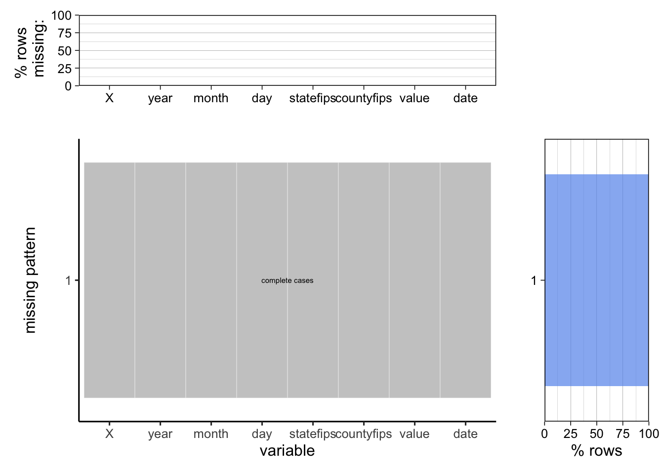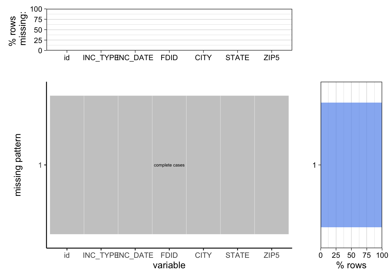 To further confirm, we used plot_missing function from library redav to check the missing percentage and pattern.